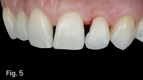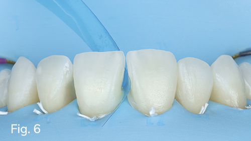 Comme la distance entre le collet et le bord incisif de ces dents est relativement importante, on commence par créer une petite base (ou « épaulement »), sur laquelle le reste de la dent est ensuite reconstruit. L'on utilise pour cela une bande préformée (BlueView VariStrip, Garrison) (Figure 6).