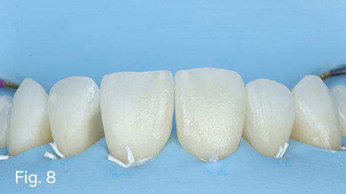 Une fois les épaulements réalisés, la bande est retirée et, si nécessaire, elle peut déjà être légèrement polie (par exemple, pour mieux répartir l'espace). La bande est ensuite repositionnée et l'espace entre l'épaulement et le bord incisif de l'élément 21 est rempli de composite (Figure 7). L'élément 11 est également construit (Figure 8). C'est ensuite au tour de l'élément 22.