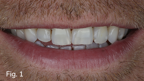 Un patient de 34 ans s'est inscrit avec un souhait d'ordre esthétique. Monsieur a naturellement des éléments étroits. Il a donc de légers diastèmes et des triangles noirs. Cela gêne monsieur depuis un certain temps, et il a demandé à son dentiste de l'époque de réduire un peu les diastèmes avec du composite. Le résultat de ce traitement n'est toutefois pas satisfaisant (Figure 1).