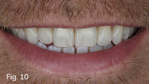 Le patient est revenu deux semaines plus tard pour une évaluation. On voit une belle intégration du composite et on voit aussi que la papille est presque de retour (Figures 9-10).