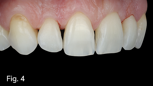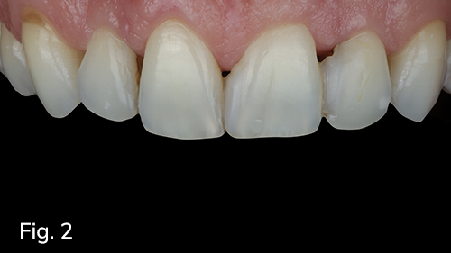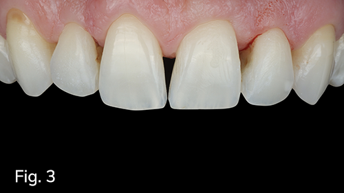 Ensuite, l'élément 12 du côté mésial sera restauré, suivi des éléments 11 et 21. Lors de la fermeture des diastèmes ou des triangles noirs, il est important d'obtenir une très bonne connexion cervicale, et de s'assurer que les deux éléments sont élargis de manière égale.