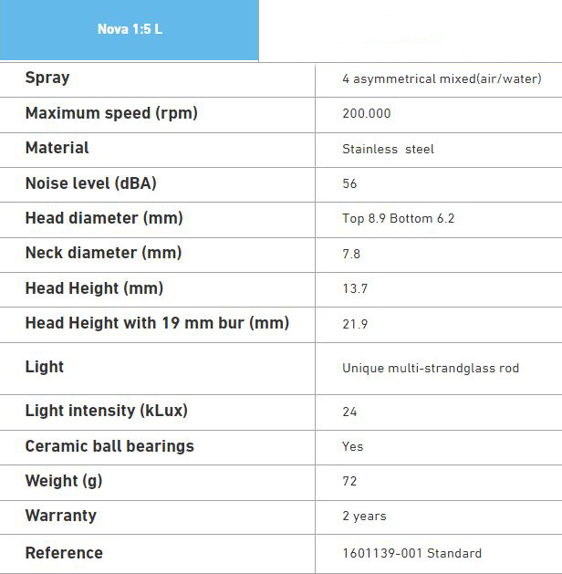 Le contre-angle NOVA 1:5L rassemble toutes les caractéristiques d'un contre-angle de haute qualité. Sa petite tête, la finesse de corps, son roulement silencieux lui permet d'être l'un des plus puissants de sa génération.