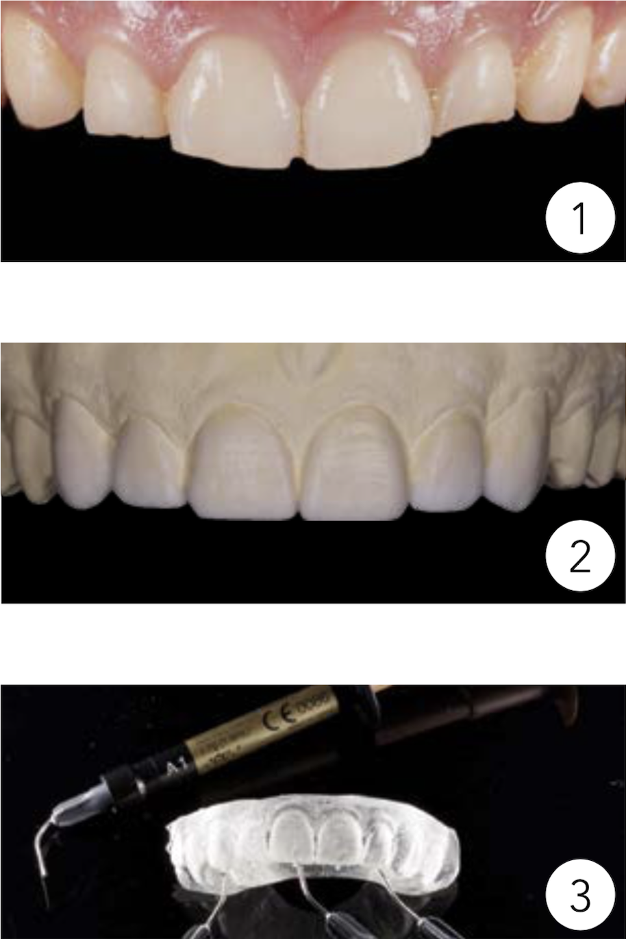 Afin de proposer une solution esthétique optimale et parfaitement reproductible (sans utiliser une méthode indirecte de facettes en céramique trop onéreuse pour ce jeune patient) nous avons convenu ensemble d’utiliser l’injectable ou IMT (Injection Moulding Technique).