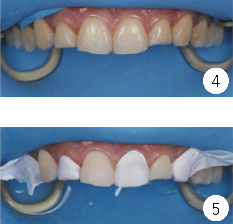 Les ‘facettes injectables’ sont injectées selon la technique ‘alternate tooth technique’ autrement dit: une dent sur deux. Une fois la première série de restaurations réalisée, il faut éliminer les excès grâce à plusieurs instruments: scalpel, fraise conique fine, strips métalliques, plastiques.