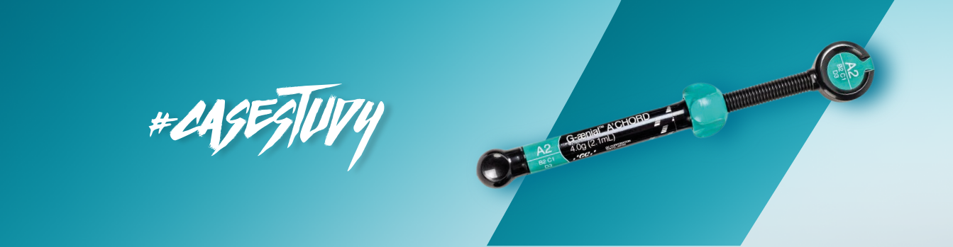 De eerste stap van de behandeling is het bepalen van de juiste kleur. Verschillende composiettinten worden op de elementen aangebracht om te evalueren welke tint het best overeenkomt. In dit geval worden G’ænial A’CHORD A2, A1, JE en AE (GC) getest.
