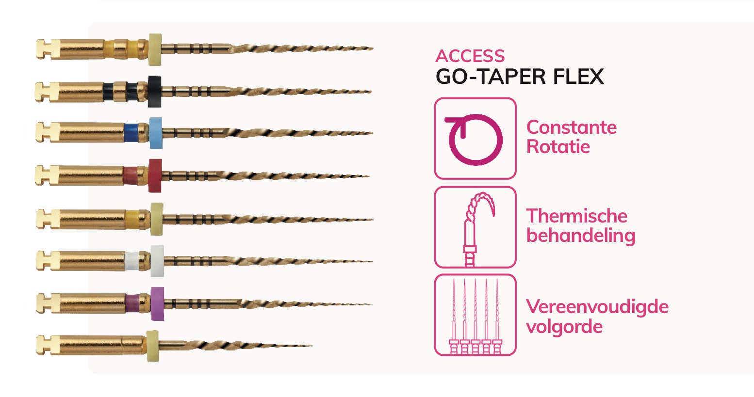 Constante rotatie met de Go-Taper Universal die het meest voorkomende type wortelkanaal preparatie mogelijk maakt met een vereenvoudigde volgorde van 5 instrumenten.