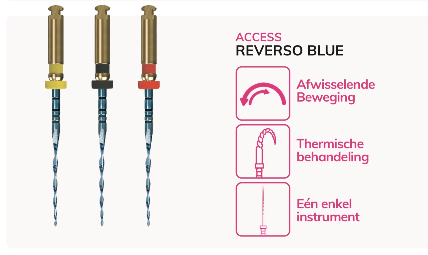 De reciprociteit van de Go-Taper Flex, Easy-File Flex en Reverso Blue kan het instrument, dankzij deze afwisselende links-rechts beweging, niet in het kanaal schroeven, waardoor het risico op een instrumentbreuk beperkt wordt.