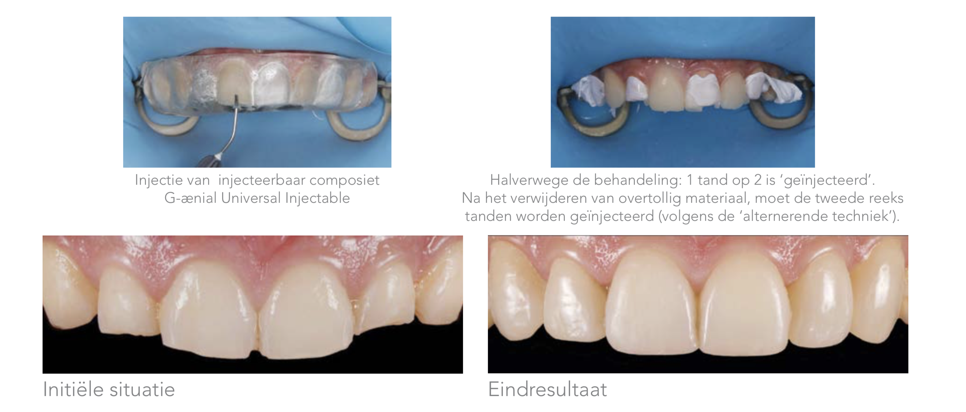 De tanden worden geïnjecteerd volgens de ‘alternerende techniek’: telkens één tand overslaan dus. De reeks tanden die bij de tweede beurt worden gedaan, worden met teflon geïsoleerd van de andere tanden (Afb. 5). Hiervoor moeten de tanden eerst worden geïsoleerd met een open rubberdam (Afb. 4). Wanneer de eerste reeks tanden klaar is, moet overtollig materiaal worden verwijderd met enkele instrumenten: scalpel, een fijne conische frees of vlamvormige vijl, metalen of plastic strips. Vervolgens wordt de tweede reeks tanden geïnjecteerd. Als afwerking wordt grondig gepolijst voor een glanzend en stabiel resultaat. Er wordt gepolijst met soflex, het Eve-systeem en vervolgens met borstels.