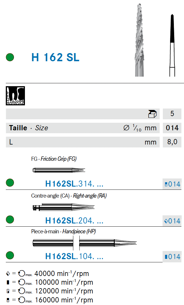 - Maximaal toegelaten rotatiesnelheid: 160000-400000 tr/mn